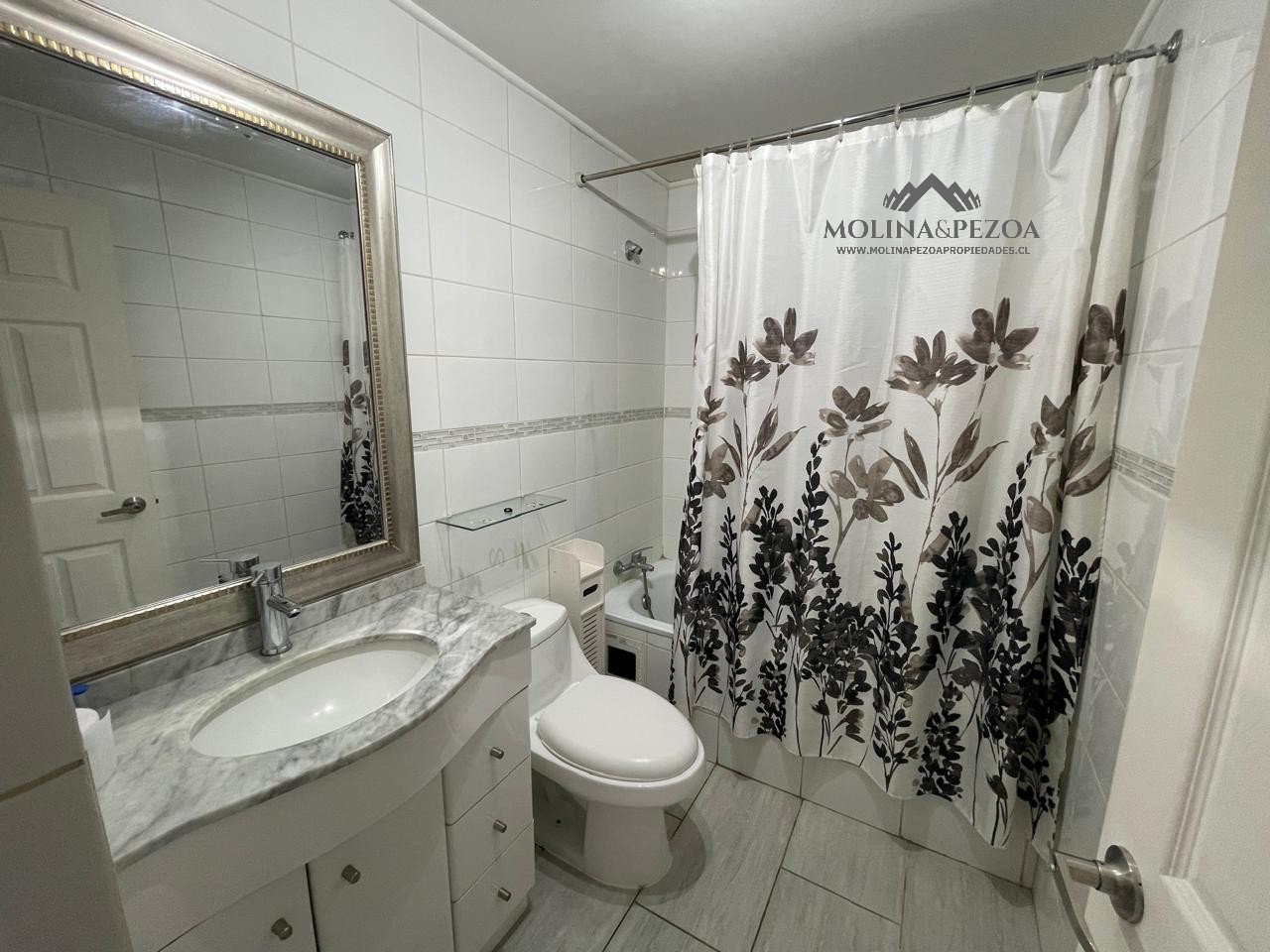 Baño completo con tina, sanitario one piece y vanitorio de mármol con mueble, revestido en cerámica.