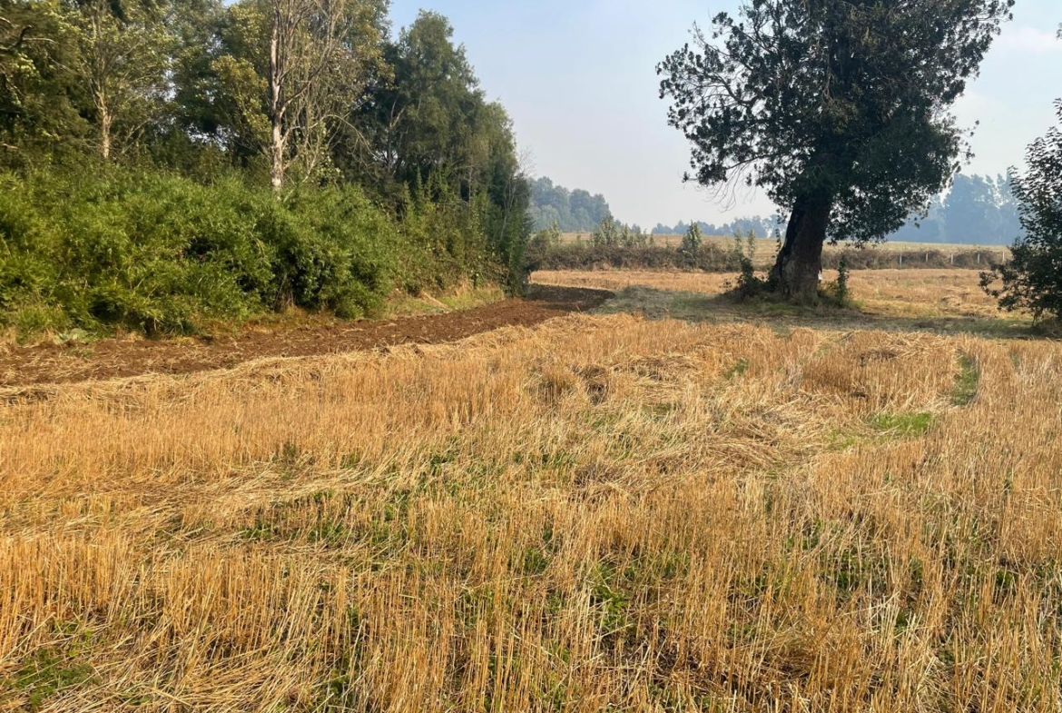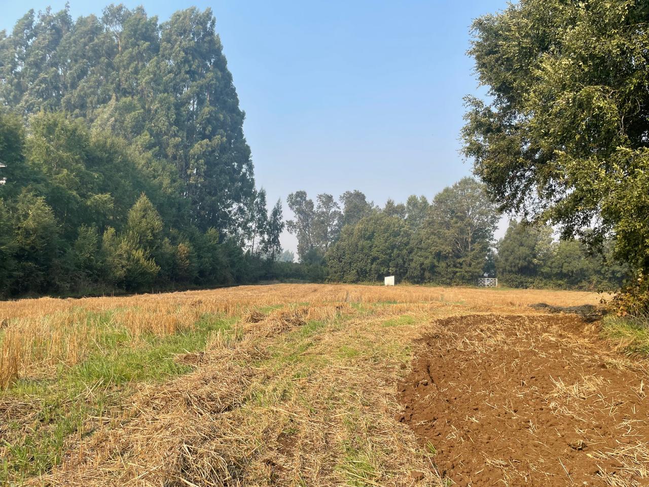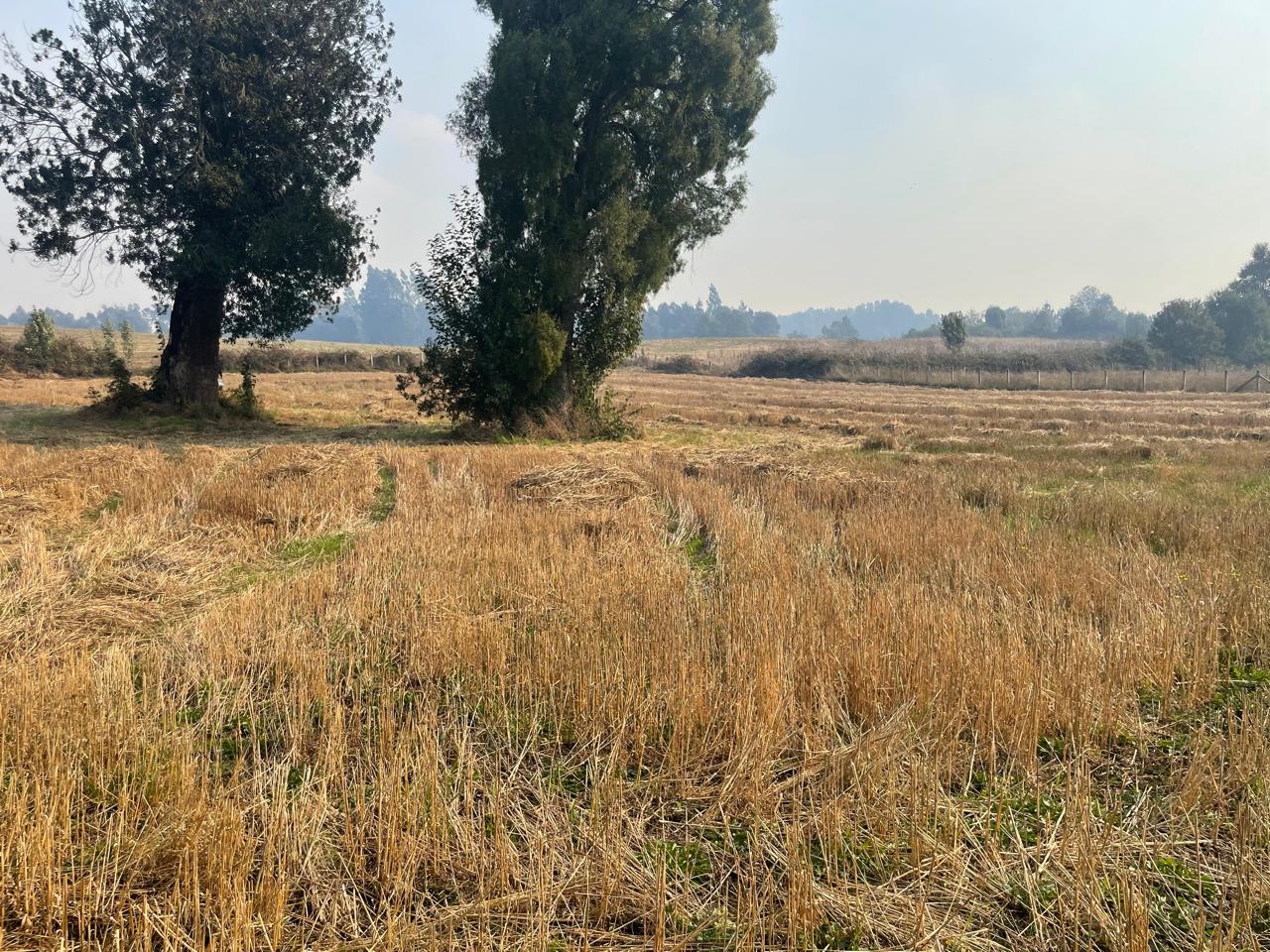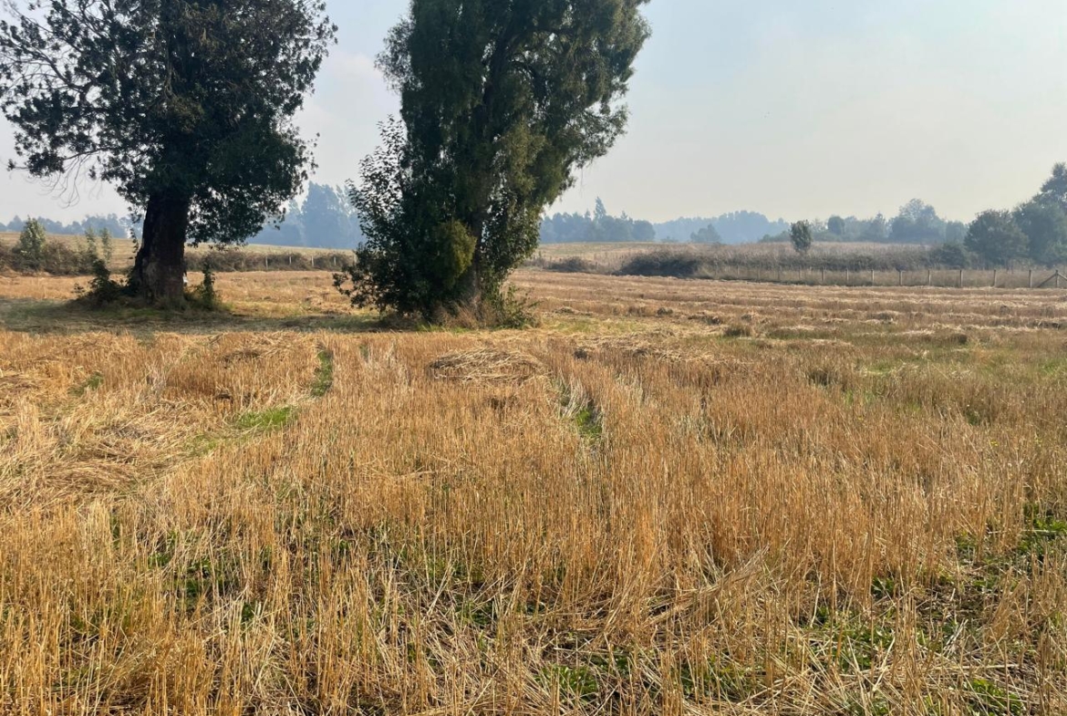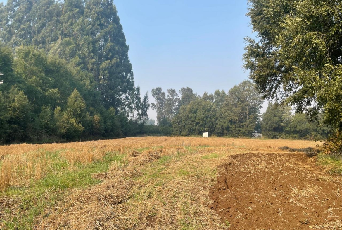 Terreno completamente plano, apto para el cultivo de cereales, con presencia de bosque de árboles nativos.