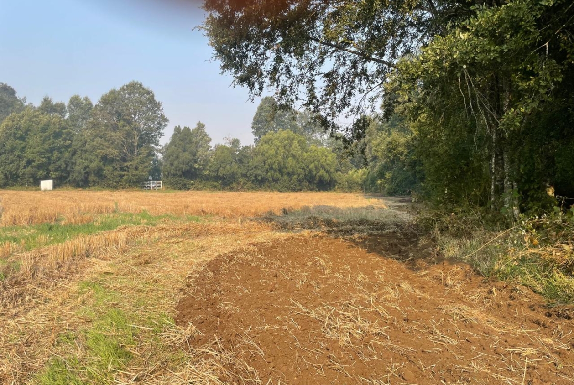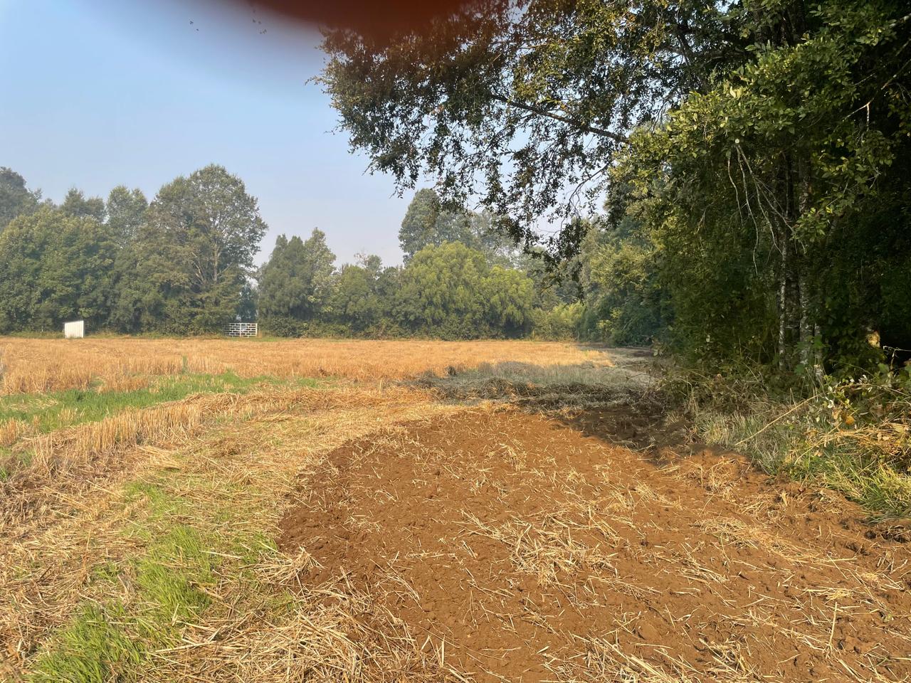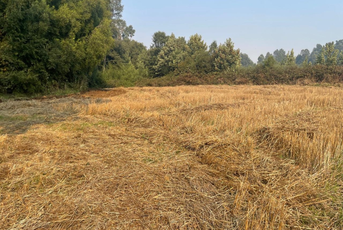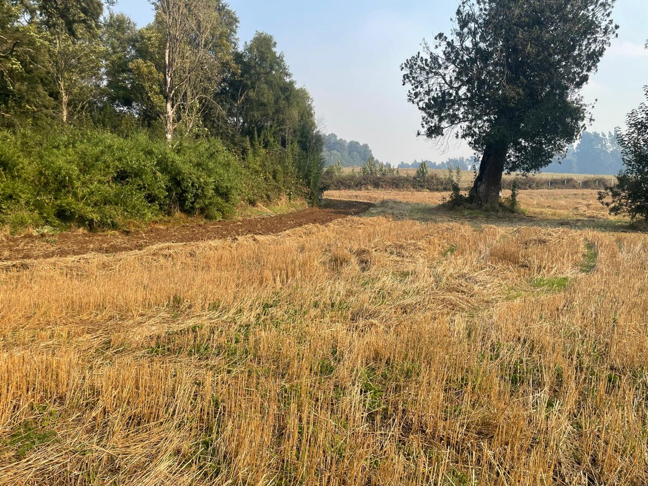 Terreno completamente plano, apto para el cultivo de cereales, con presencia de bosque de árboles nativos.