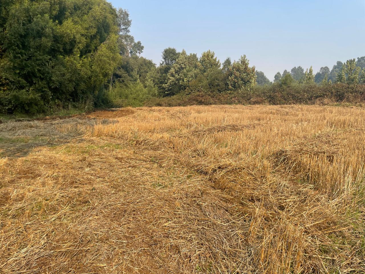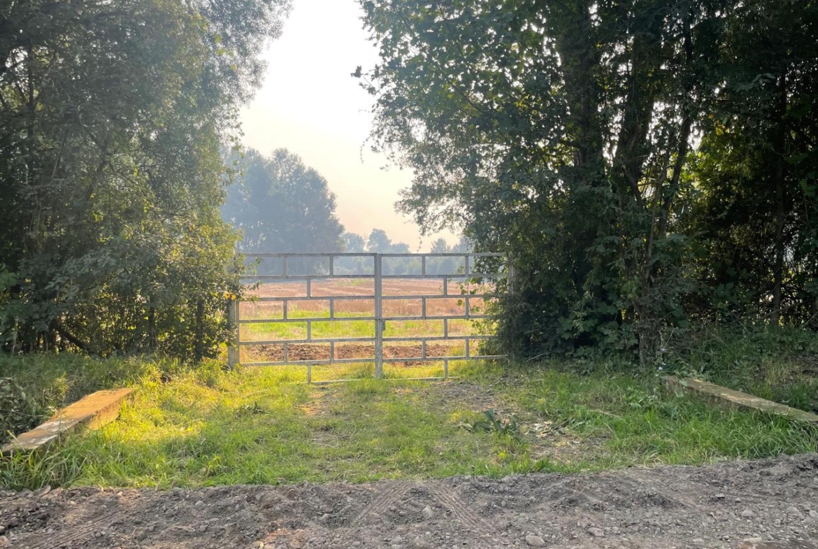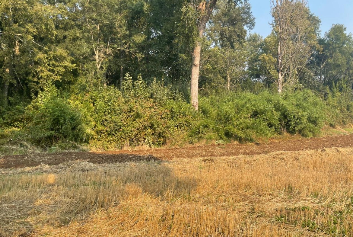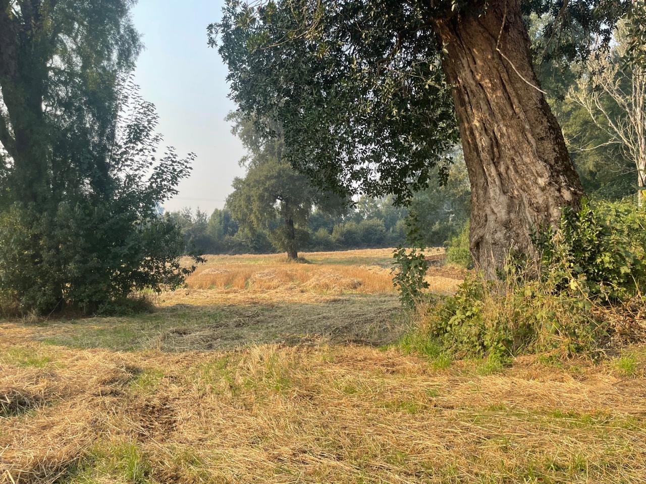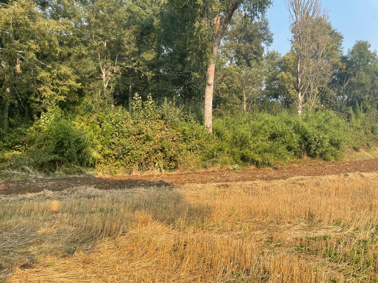 Terreno completamente plano, apto para el cultivo de cereales, con presencia de bosque de árboles nativos.